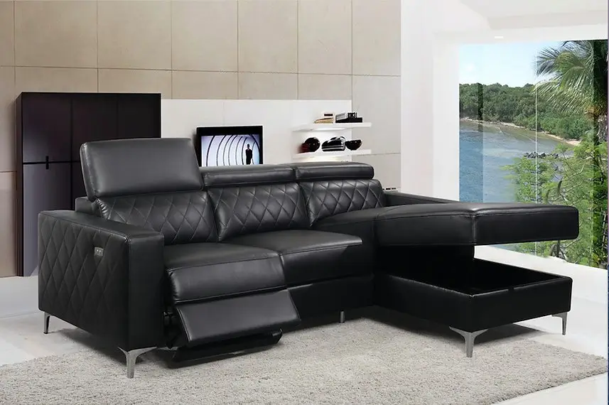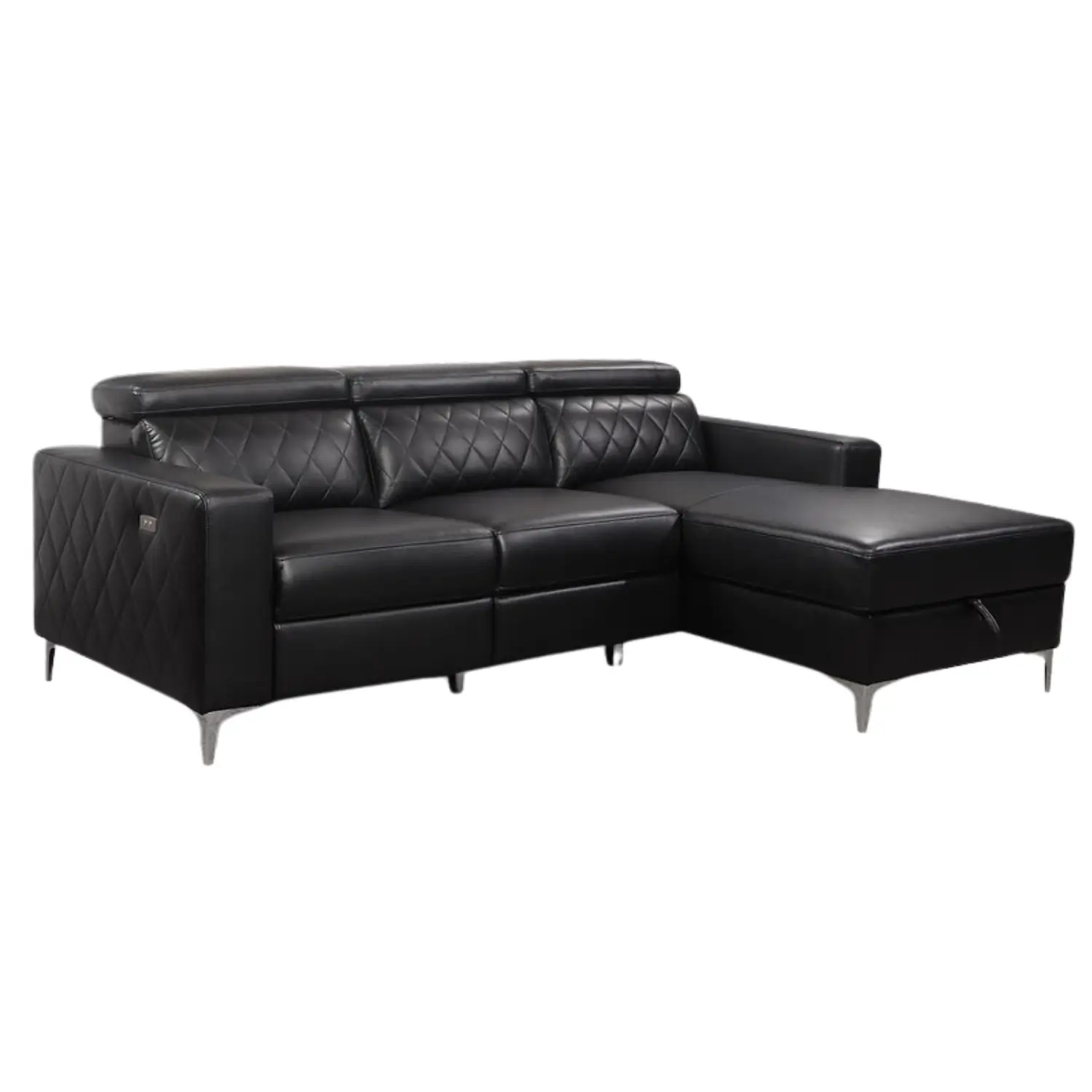 Right Hand Facing Chaise Power Recliner Large Lift up Storage Compartment. Diamond Pattern Stitching Adjustable Headrests Adjust from 32″-39″H Black Leather Gel