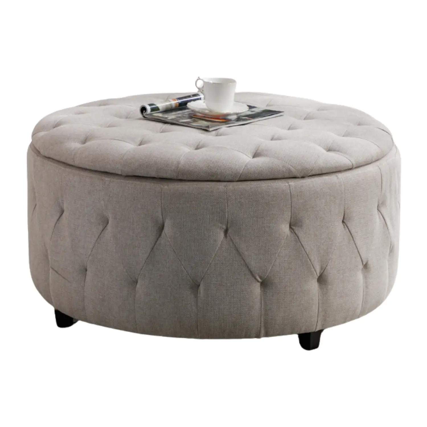 Meet our ingenious storage ottoman, a stylish and versatile addition to your living space. Draped in neutral linen colors and featuring elegant button tufting, this ottoman holds a remarkable secret – it’s not just for resting your feet!