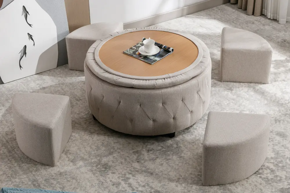 Hidden Treasures Inside: Beneath the cozy exterior, a delightful surprise awaits. Remove the top to reveal four cushioned stools, instantly transforming your ottoman into additional seating for guests, movie nights, and gatherings.