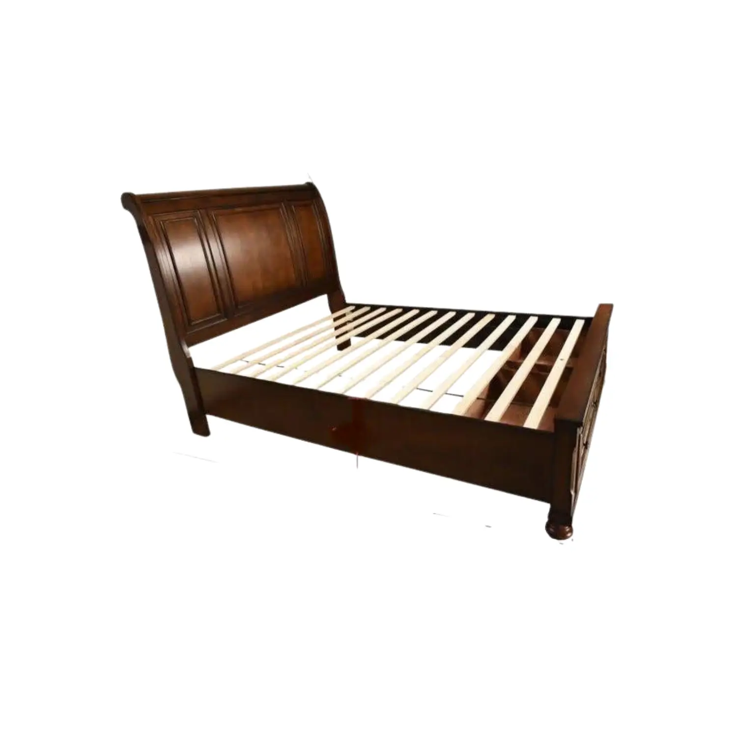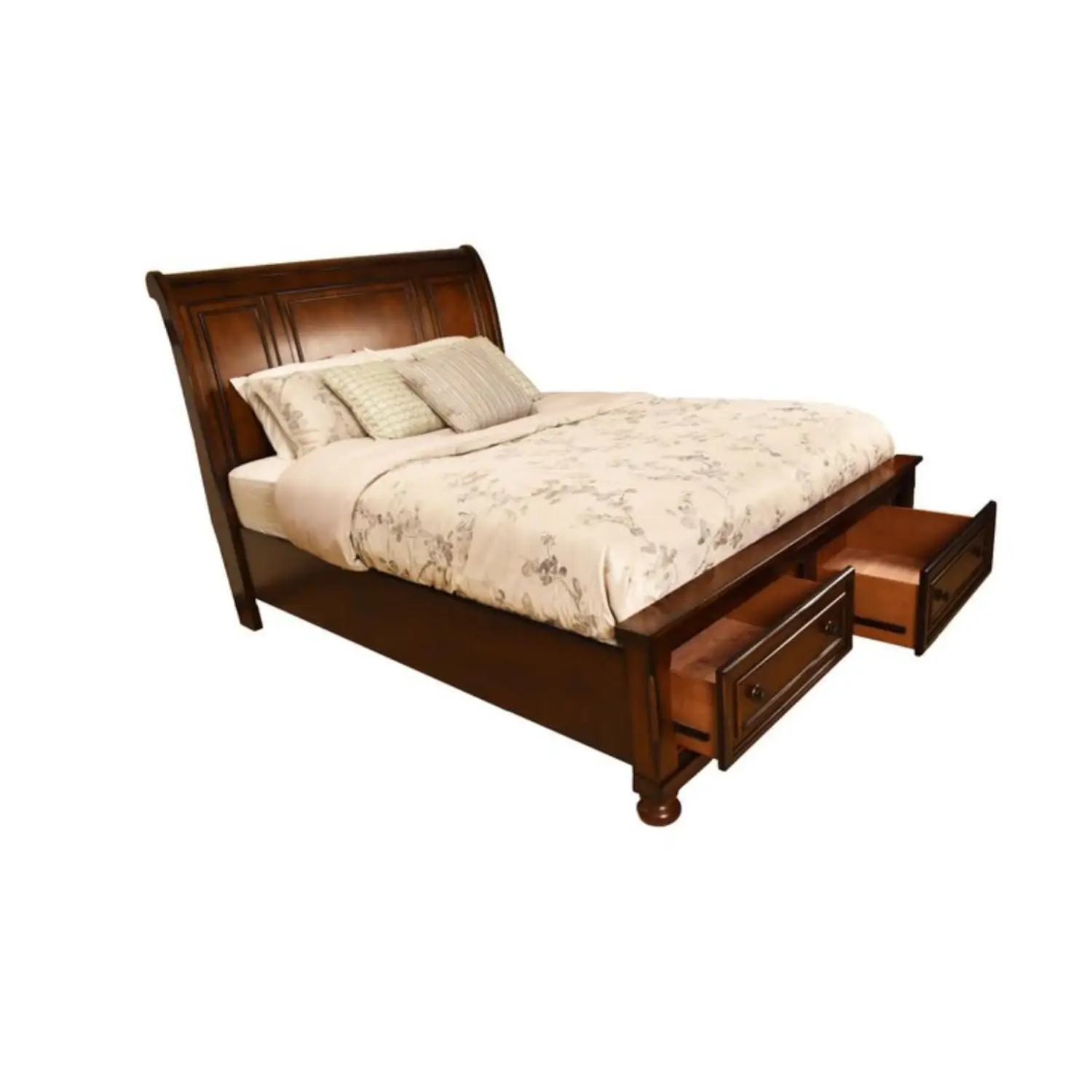 Sleigh Bed Elegance: Begin with our captivating sleigh bed, the centerpiece of this stunning collection. Its cut panel design and swooping headboard will immediately draw the eye, setting the tone for your entire room. With two convenient foot-board drawers, this bed offers more than just good looks – it provides valuable storage space. Dressed in a stylish wood veneer, it adds a touch of sophistication. The platform base of the bed ensures stability and durability, all while eliminating the need for a box spring. It’s all about convenience and comfort.